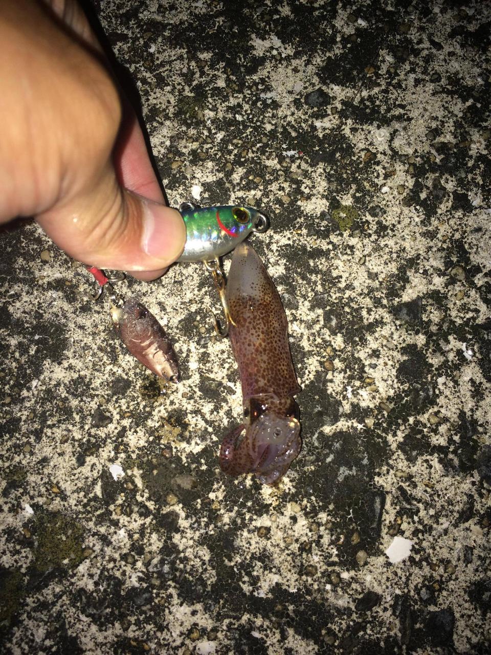 コウモリの様な赤黒いイカと言うかタコ釣った。
